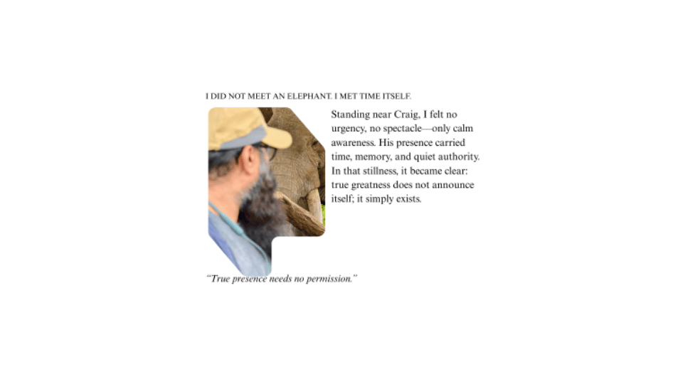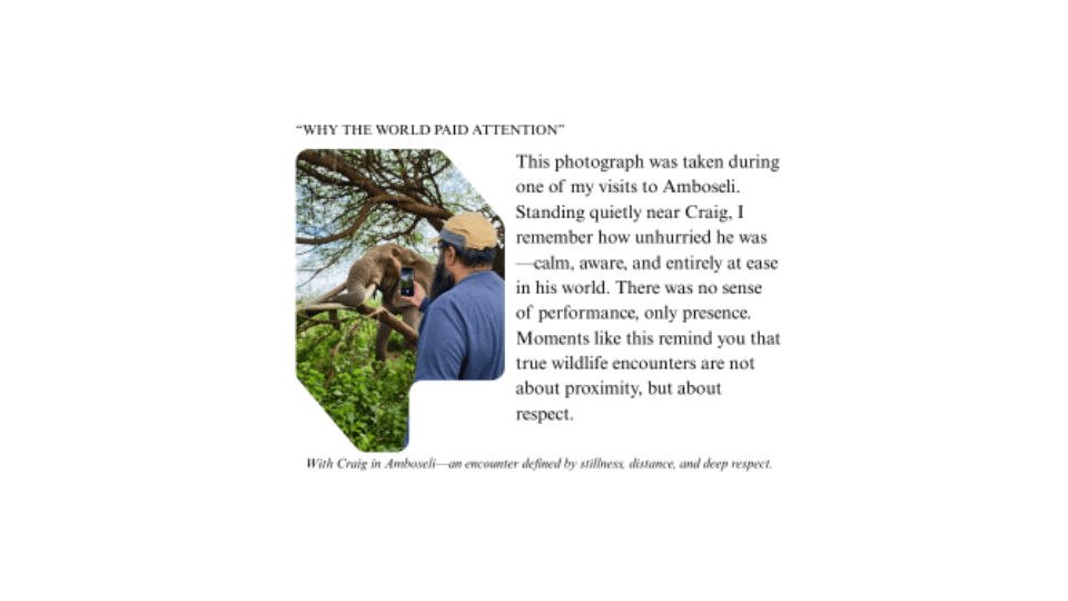 What made Craig exceptional was not only his size, but his temperament. He was known to be calm, unaggressive, and unbothered by vehicles or people. Photographers often describe him as an elephant who seemed aware of his presence—unhurried, grounded, and deeply at ease in his world.